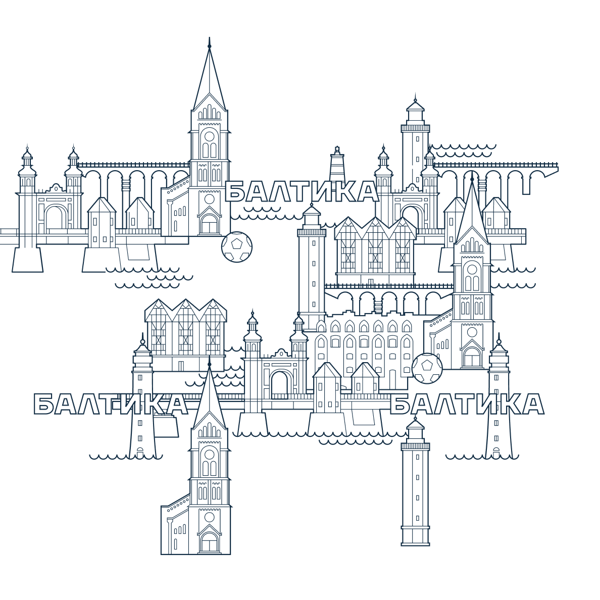 Калининград сегодня — один из ключевых туристических центров страны, это подчеркивает городской паттерн. Он формируется силуэтами объектов уникальной архитектуры города — церкви Михаила Архангела, замка Рагнит и моста королевы Луизы, а также аутентичных маяков области.