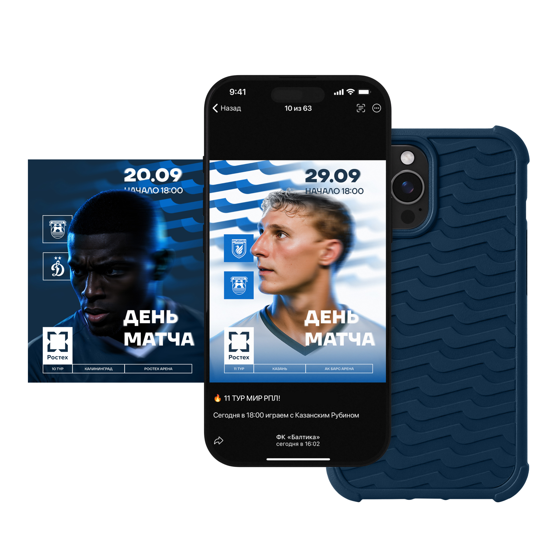 Оформление диджитал-активностей «Балтики» в социальных сетях выполнено в двух версиях — для домашних и выездных игр. Фирменный паттерн с волной может использоваться в том числе в производстве клубного мерча. Кейс для мобильного телефона с таким паттерном может стать дополнением к повседневному образу болельщика.