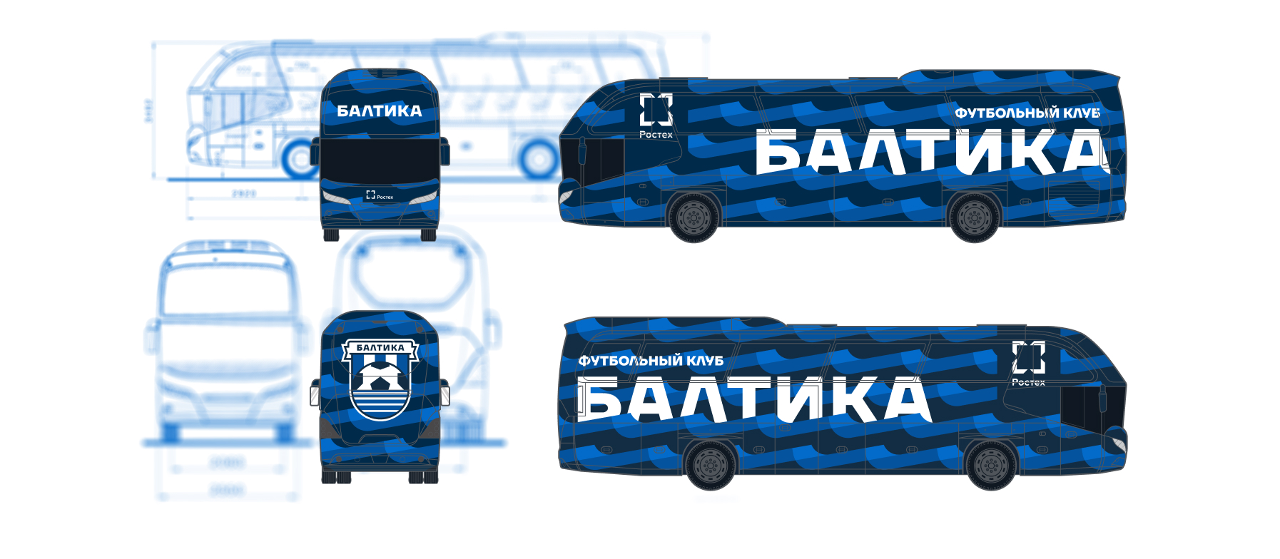 Клубный транспорт, в котором команда проводит немало времени — заметный визуальный объект. В его оформлении использован характерный паттерн «Волны», между ними размещено название клуба.